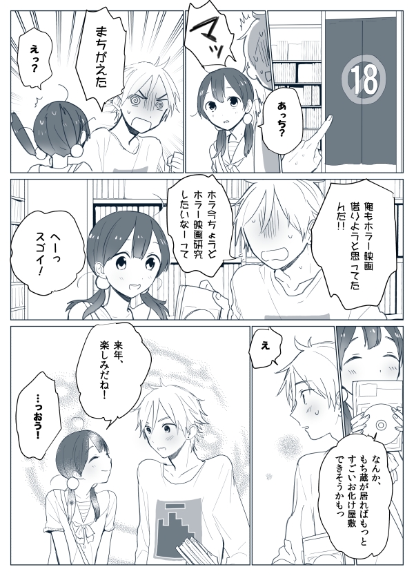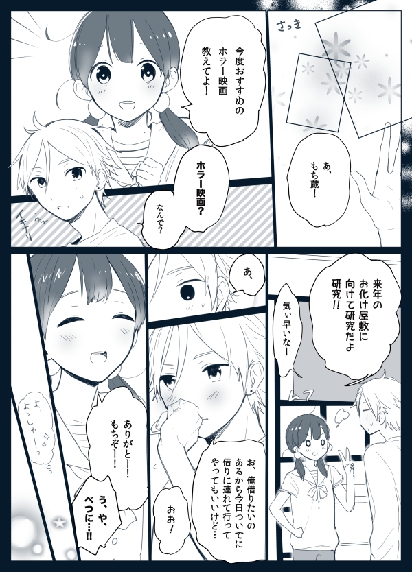 これを描いたの6月とかだと思いますがやっとそれらしい時期に…。 定石だと思いますがホラー映画を見る二人って本当に可愛いですよね。 たまこにもっともち蔵に興味持ってもらいたいな!という気持ちを込めました。 たまこの感情は私が描いてみるとそんなに大げさにならないのでわかりづらいような気がしますが、読んでくれる人にも、もち蔵にも伝わってくれると嬉しいです。(ここまで全部妄想)(2013/08/27)