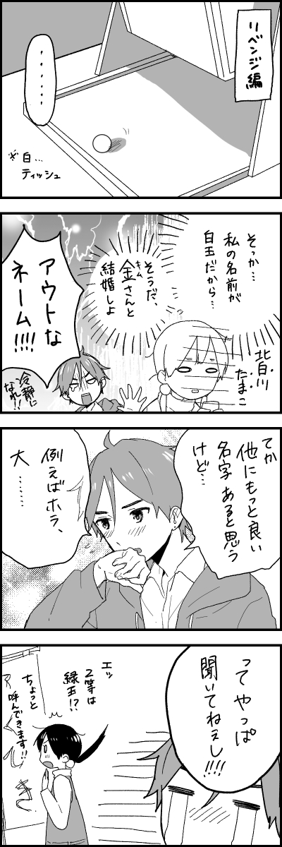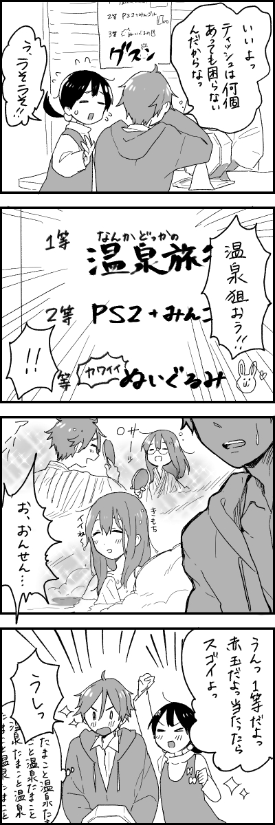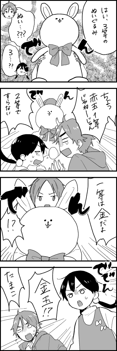 たまこは多分、景品とか何等だとかそういうのが重要なわけではなくて、商店街の福引というものを全力で楽しみたいと思ってそう。なのでほんとクソみたいなラインナップがいいなと思ったので4等は駄菓子屋のお姉さん提供の駄菓子詰めです。 実際たまこはラッキーガールなのでドバーンと一等とか当てちゃいそう!な感じがします! もち蔵はティッシュ。 (2014/03/07)